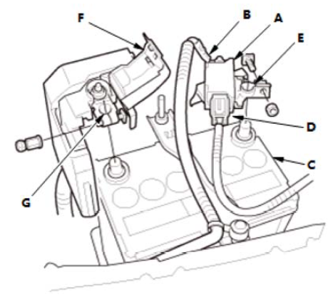 3.打开盖(F)。 4.从12 V 蓄电池上断开正极端子 (G)。