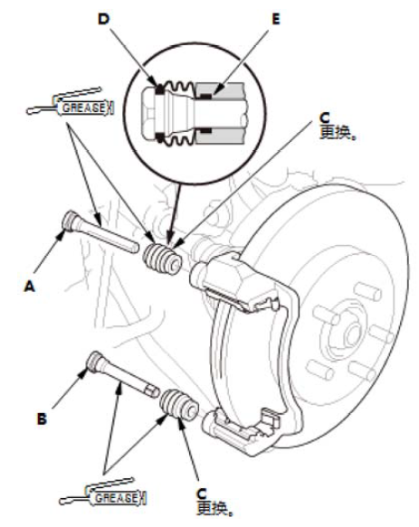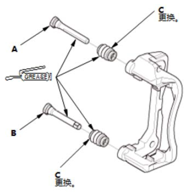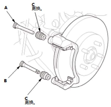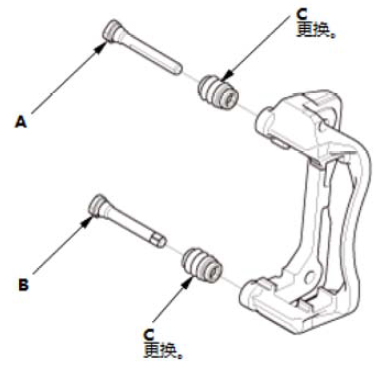 1.在卡钳销A、卡钳销B 和新的销护套 (C) 上涂抹橡胶润滑脂。 2.安装销护套。 3.安装卡钳销。