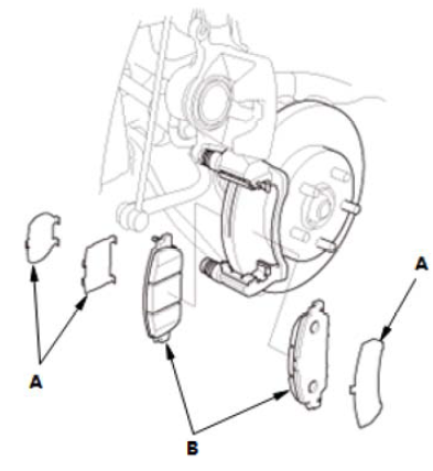 3.拆下垫片 (A) 和制动片 (B)。 |