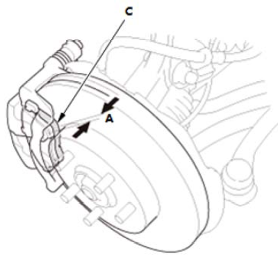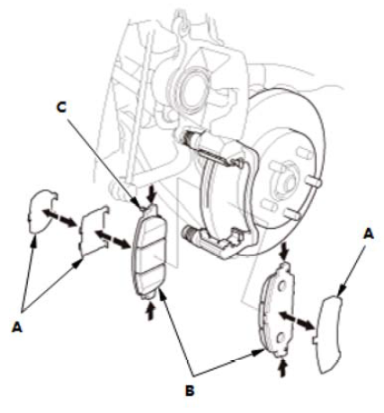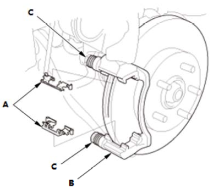 1.拆下制动片夹持器 (A)。 2.彻底清洁卡钳支架 (B);清除所有锈迹并检查是否有凹槽或裂纹。 3.验证卡钳插销(C) 进出顺畅。如有必要,清洁并润滑。 |