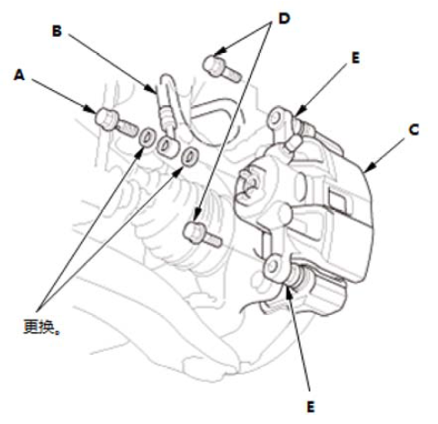 1.拆下对接螺栓 (A),并将制动软管 (B) 从卡钳主体 (C) 断开。 2.使用扳手固定卡钳插销(E) 时,拆下法兰螺栓 (D)。 |