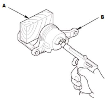 1.将市售制动钳活塞压缩工具 (A) 安装到制动钳体 (B) 上。 2.用制动钳活塞压缩工具压入活塞。
