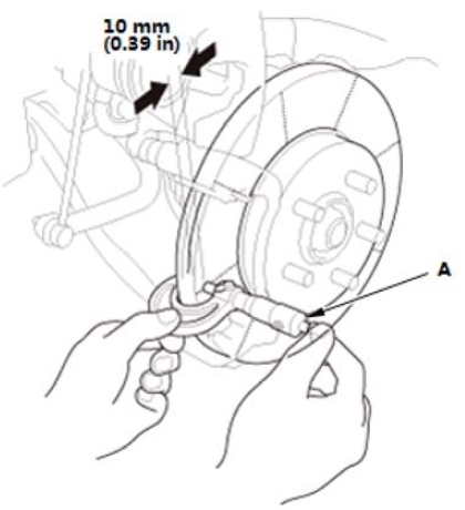 1.在制动盘上大约间隔 45 °、离制动盘外边缘10 mm 的八个点上,使用千分尺 (A) 测量制动盘的厚度。如果最小测量值小于最大表面修整极限,则更换制动盘。 制动盘平行度*: 最大 0.015 mm *:这是厚度测量值的最大允许差值。 2.如果制动盘的平衡度超出了使用极限,则用市售车载制动器车床修整制动盘表面。