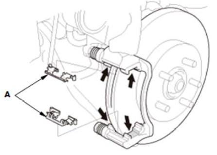 1.在卡钳支架的夹持器接合面上涂抹 Molykote M-77 润滑脂(通过箭头显示)。 2.安装制动片夹持器 (A)。 3.清除夹持器上的多余润滑脂。使润滑脂远离制动盘和制动片。 |