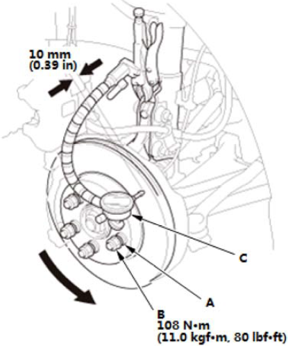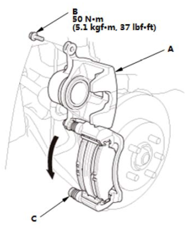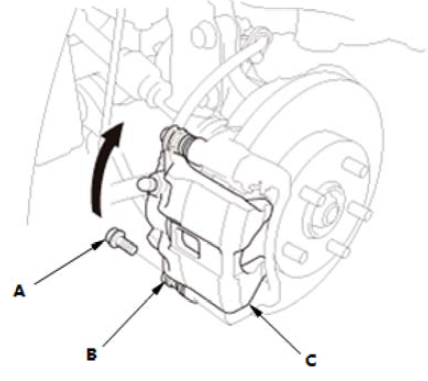 7.将制动钳体 (A) 向下转至正确位置。 8.用扳手固定住制动钳销(C),安装法兰螺栓 (B),并将其紧固至规定的扭矩。