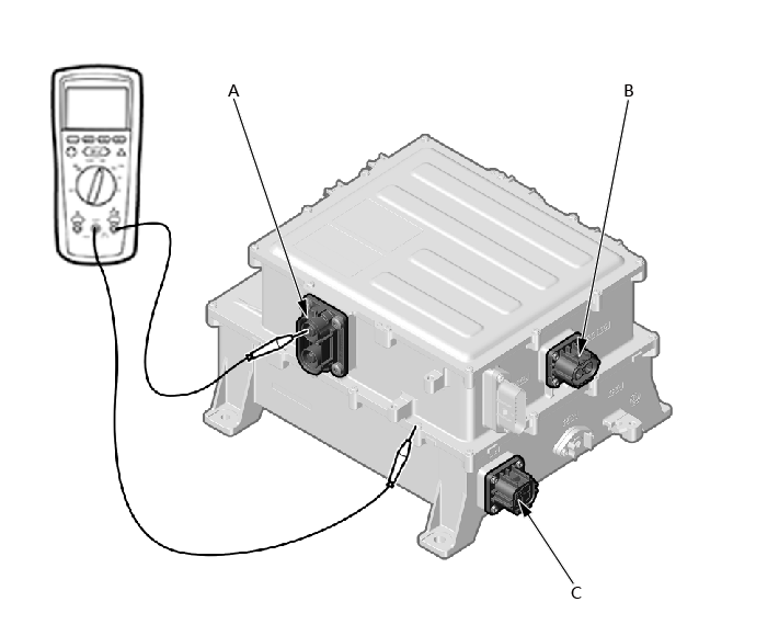2.用同样的方法测量三合一(暖风加热器PTC高压电缆端)插头(B)、三合一(慢充高压电缆端)插头(C)。