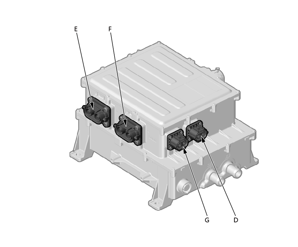 3.测量三合一(电动空调压缩机电缆端)插头(D)、三合一(驱动电机电缆)插头(E)、三合一(动力电池包电缆)插头(F)、三合一(动力电池包加热器PTC)插头(G),观察测量值是否大于10MΩ。
