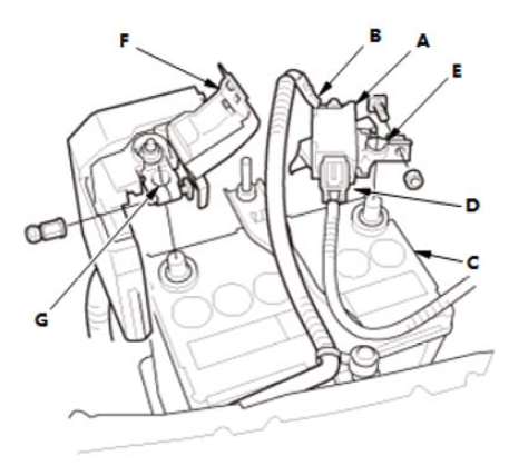 3.打开盖(F)。 4.从12 V 蓄电池上断开正极端子 (G)。