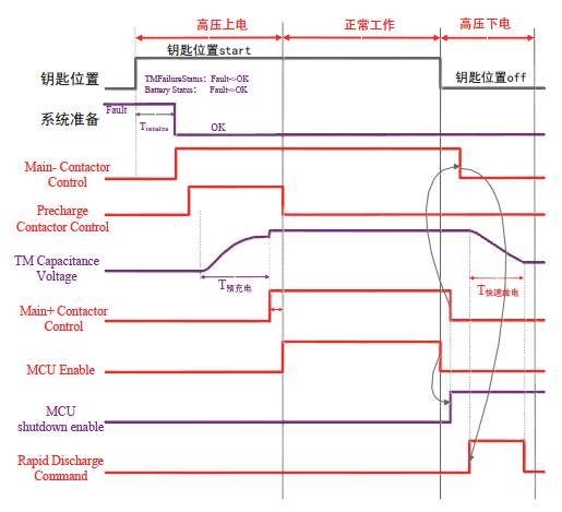| 1)高压上电过程: VCU识别高压上电条件满足,请求BMS闭合高压继电器,控制电机回路预充电,完成上电; 2)正常工作过程:VCU保持高压,上电,各高压部件正常工作; 3)高压下电过程:VCU识别高压下电条件.满足,请求BMS断开高压继电器,控制电机快速放电,完成下电。 |
