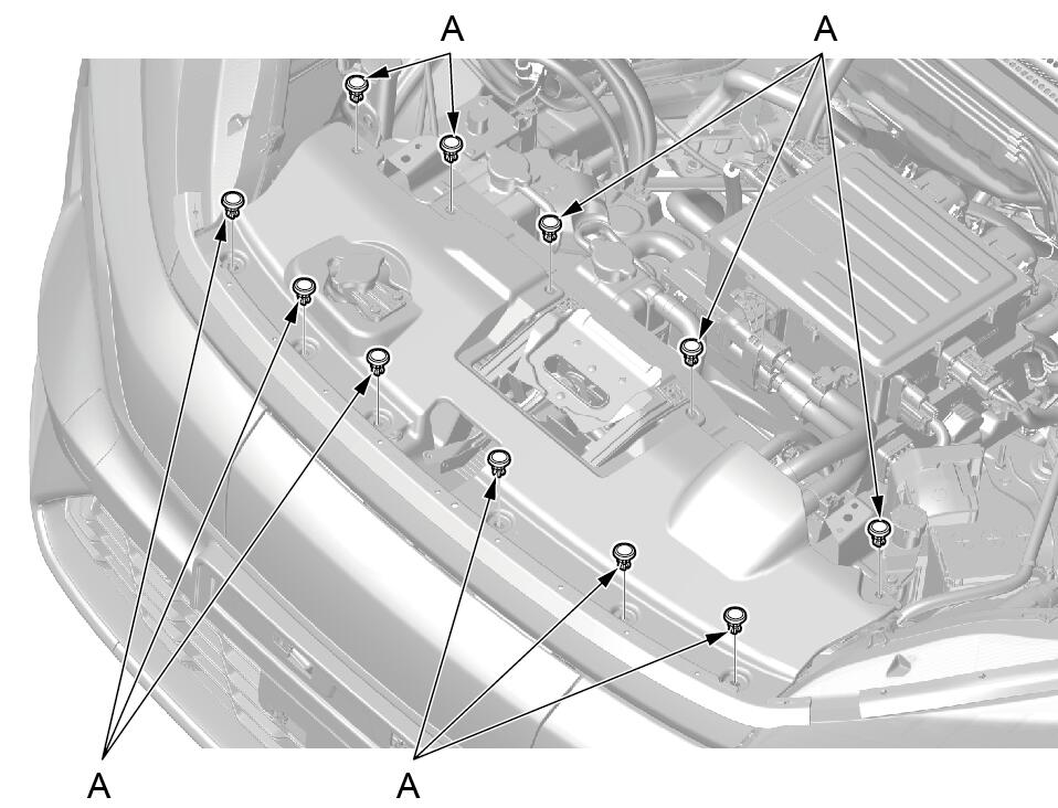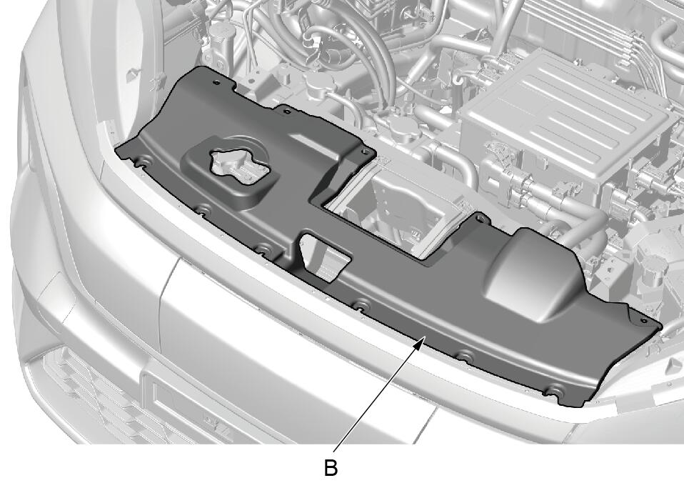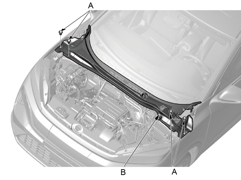 1. 使用内饰板拆卸工具拆卸前罩板固定卡夹(A),取下前罩板(B)。