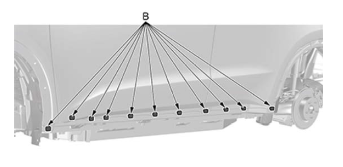 2. 使用内饰件拆卸工具拆卸侧门槛固定卡扣(B)。