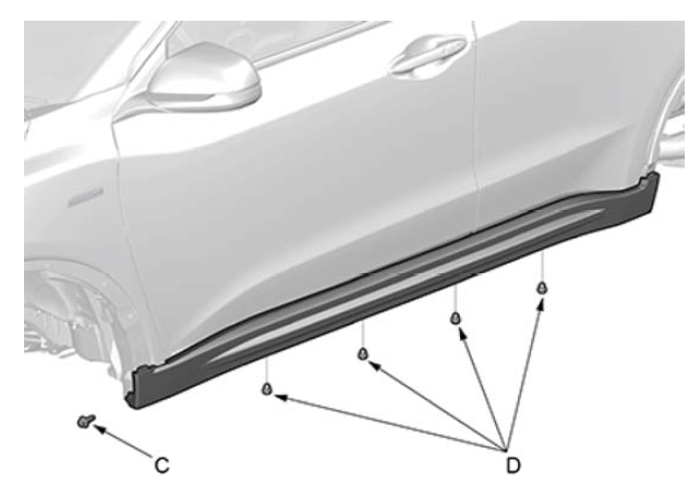 3. 使用十字起拆卸侧门槛板亮条固定螺钉 (D)。