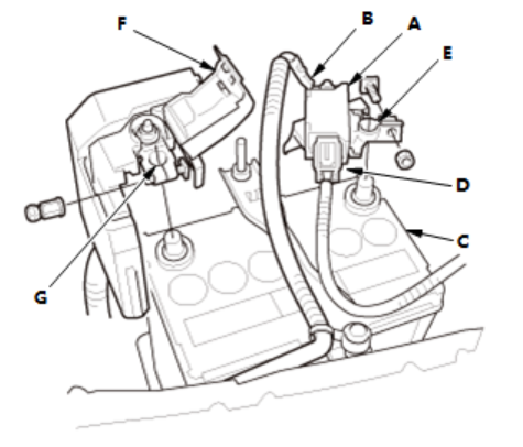 3.打开盖(F)。 4.从12 V 蓄电池上断开端子 (G)。 |