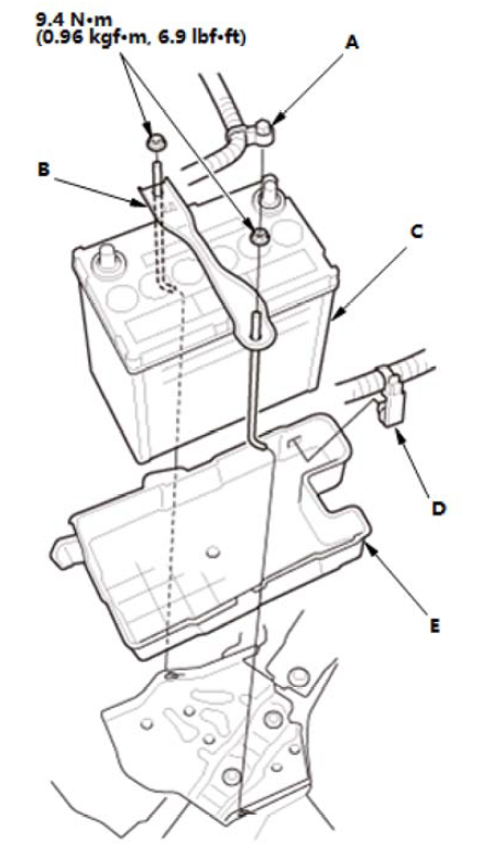 1.拆下线束夹(A)。 2.拆下 12 V 蓄电池固定板 (B) 和 12 V 蓄电池(C)。 3.拆下线束夹(D)。 4.尝试拆下 12 V 蓄电池支架 (E)。 |
