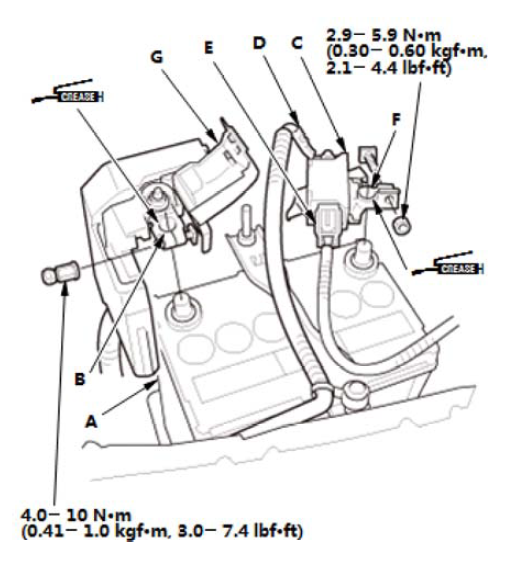 4.在端子上涂抹多用途润滑脂以防腐蚀。 5.关闭盖(G)。 |