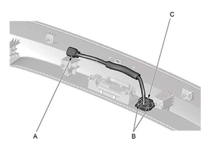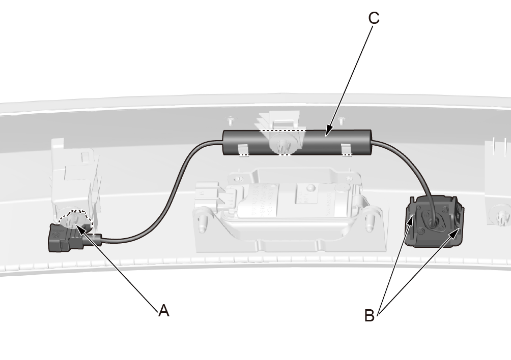 1. 使用内饰件拆卸工具脱开插接器固定卡(A)。 2. 撬开后视摄像头固定卡(B),取出后视摄像头 (C)。 |