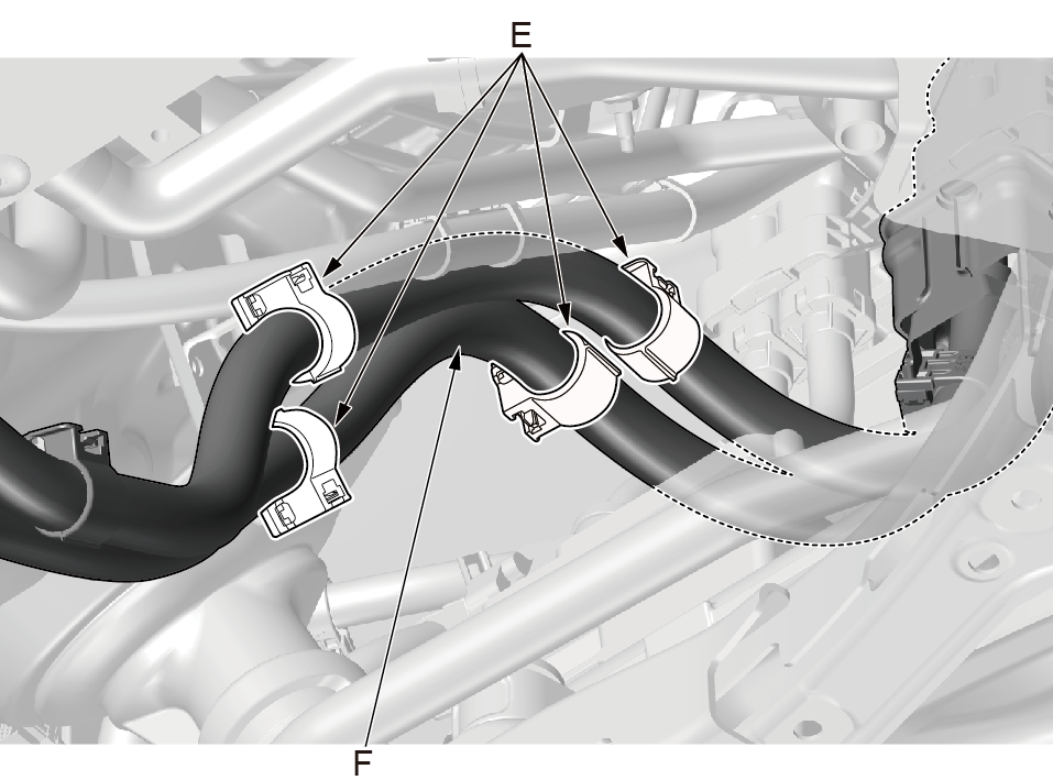 7.使用内饰件拆卸工具拆卸动力电池包高压线束卡夹(E)。 8.取出动力电池包电缆(F)。 |