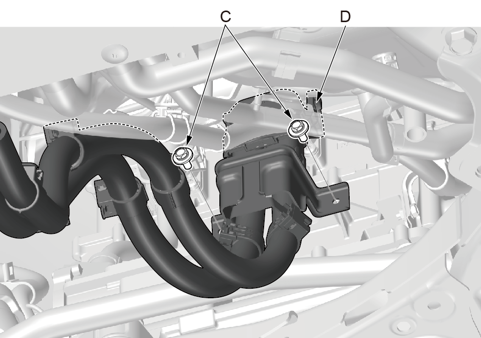 4.使用10mm套筒拆卸动力电池包高压电缆的固定螺栓(C)(M6×12)。 5.脱开动力电池包高压线束插接器卡夹,脱开动力电池包高压线束插接器(D)。 |