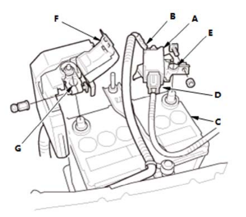 3.打开盖(F)。 4.从12 V 蓄电池上断开正极端子 (G)。