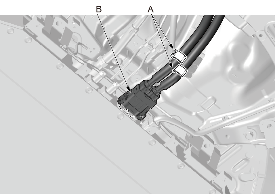 1.脱开动力电池包高压线束固定卡扣(A)。 2.脱开动力电池包高压线束插接器(B)。 |