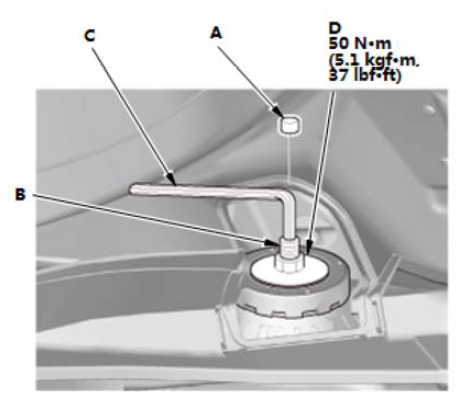 2.拆下减振器盖(A)。 3.使用六角扳手 (C) 固定减振器轴(B),并拧松减振器安装螺母 (D)。 |