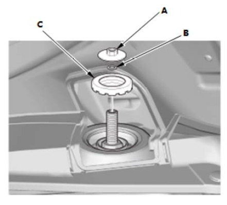 4.拆下减振器安装螺母 (A)、弹簧垫圈 (B) 和减振器安装座(C)。 |