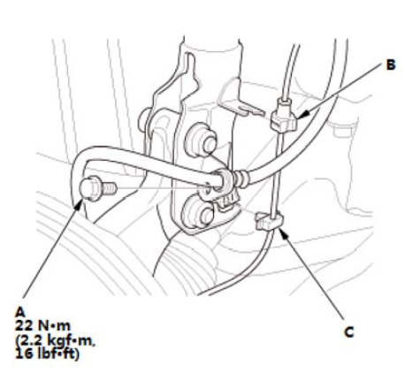 1.拆下制动软管安装螺栓 (A)。 2.拆下车轮转速传感器线束导胶(B) 和卡扣 (C)。 |