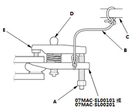 4.通过转动调节螺栓 (D) 调整钳口间距。 5.确保调节螺栓的头部处于图中所示位置,以允许钳口 (E) 张合。 6.拧紧压力螺栓,直到球头销塞从球头连接孔松脱。如有必要,涂抹渗透型润滑剂来松动球头销。