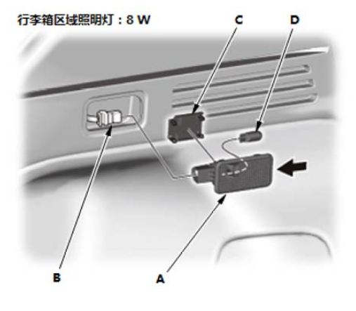 行李箱区域照明灯位于左后侧装饰件中。当尾门打开时,行李箱区域照明灯点亮。