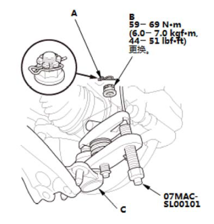 3.用球节拆卸工具将下球节(C) 从转向节上拆下。