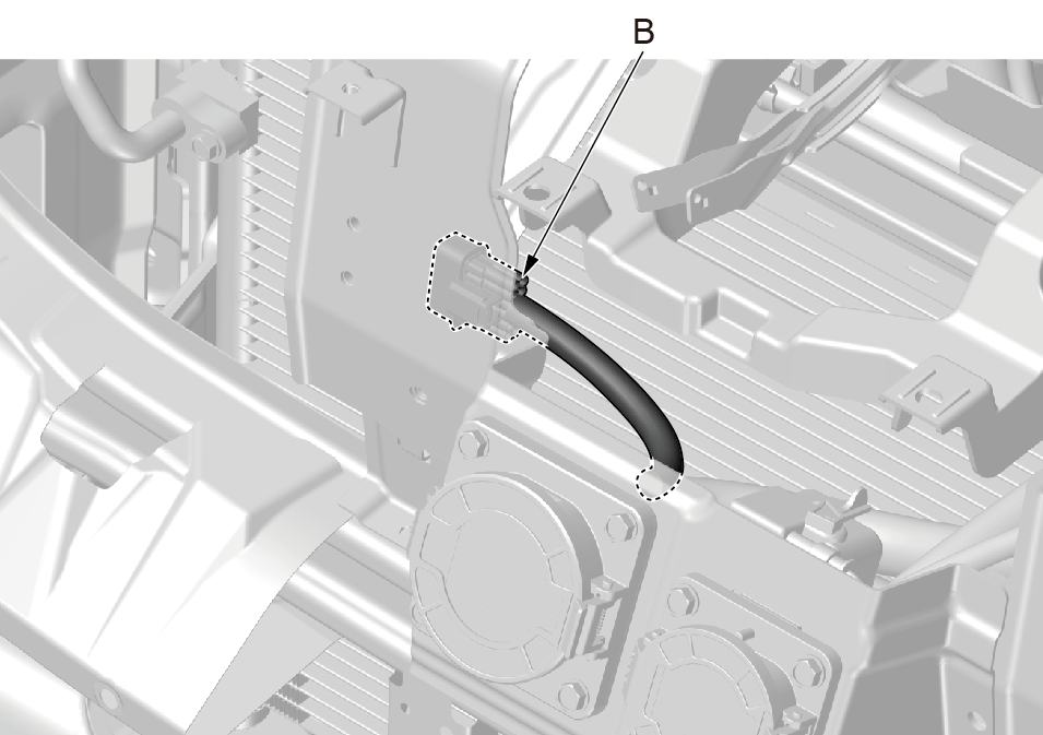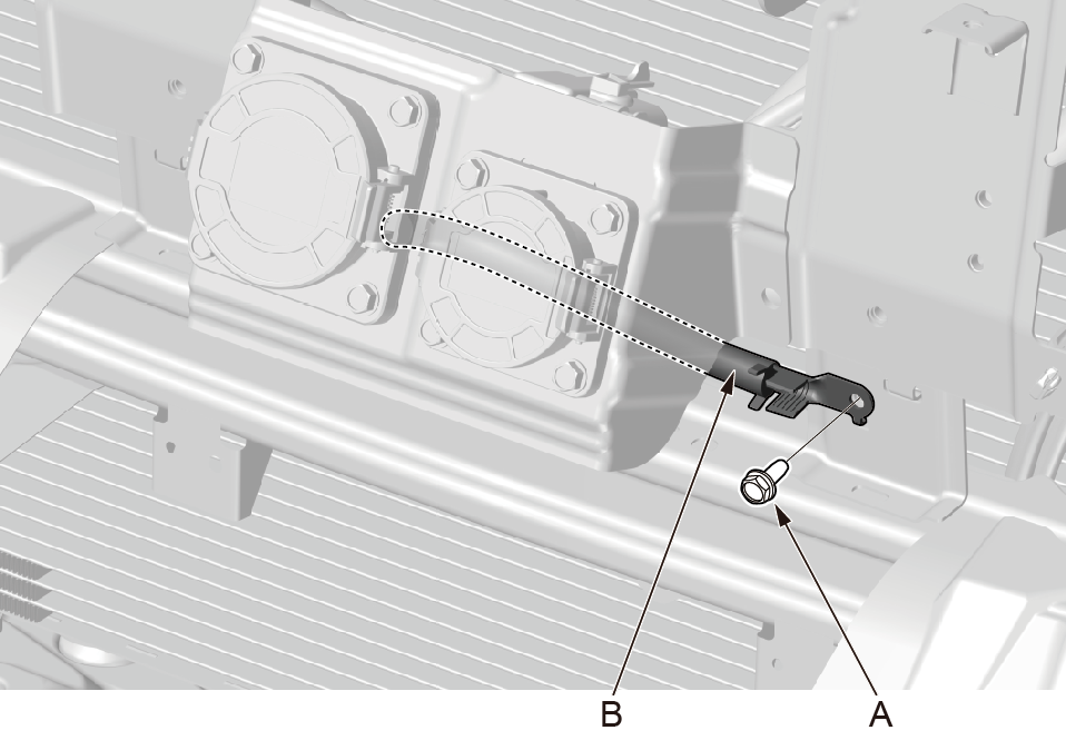 1.使用 10mm套筒拆卸快充充电头搭铁线束固定螺栓(A)(M6×14),脱开搭铁线束(B)。 |