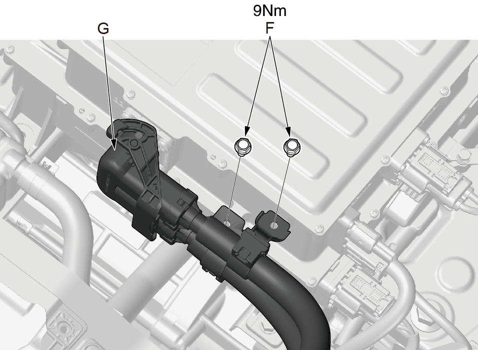 6.使用10mm套筒扳手拆卸快充电缆支架固定螺栓 7.脱开快充电缆插接器(G)。 |