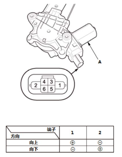 1. 根据下表,通过连接 12 V 蓄电池电源和搭铁至连接器(A) ,在各方向测试驾驶员侧电动车窗电机。当驾驶员侧电动车窗电机停止运转时,立即断开12 V 蓄电池电源。