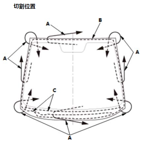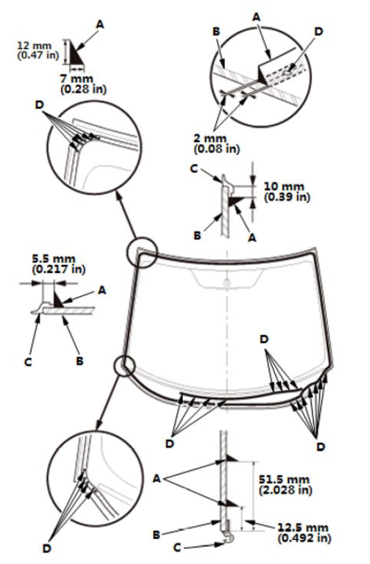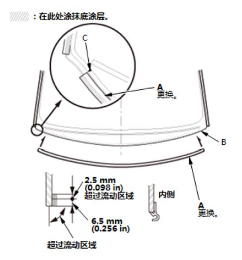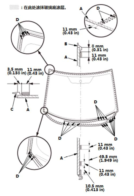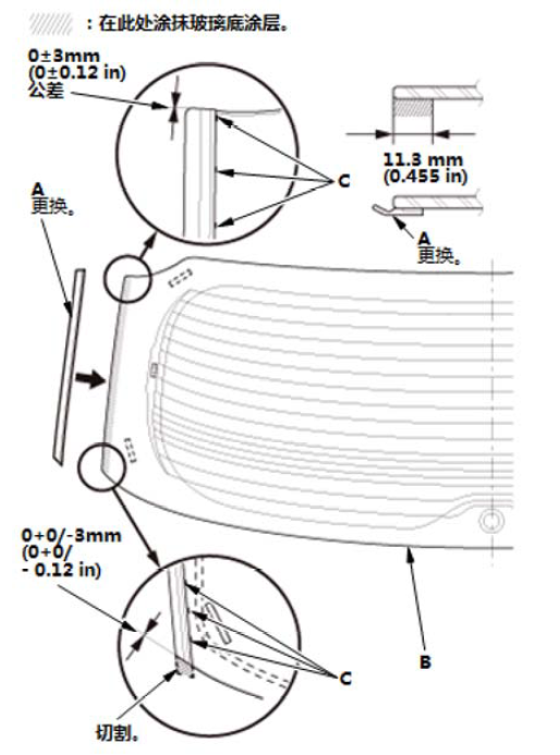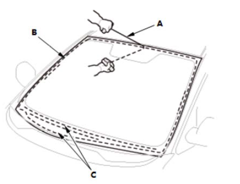 10. 如图所示,沿着挡风玻璃装饰条(B) 和挡风玻璃侧装饰条(C) 的边缘在挡风玻璃 (A) 上涂一薄层玻璃底涂层,然后用纱布或粗棉布轻轻擦除。