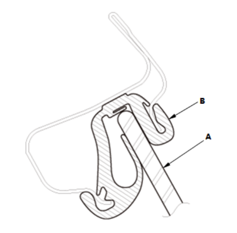 1.使用经异丙基酒精浸湿的抹布清洗车身粘合表面。清洗后,避免机油、润滑脂和水溅到清洗表面。 2.如果要重新安装原来的挡风玻璃,使用油灰刀刮除挡风玻璃上旧的粘合剂、卡扣、橡胶密封条和仪表板密封条。使用异丙基酒精清洗内表面和挡风玻璃边缘的粘合表面。确保粘合表面没有水、机油和润滑脂。 3.如图所示,用胶带将新的上卡扣 (A) 安装到挡风玻璃 (B) 的内表面。