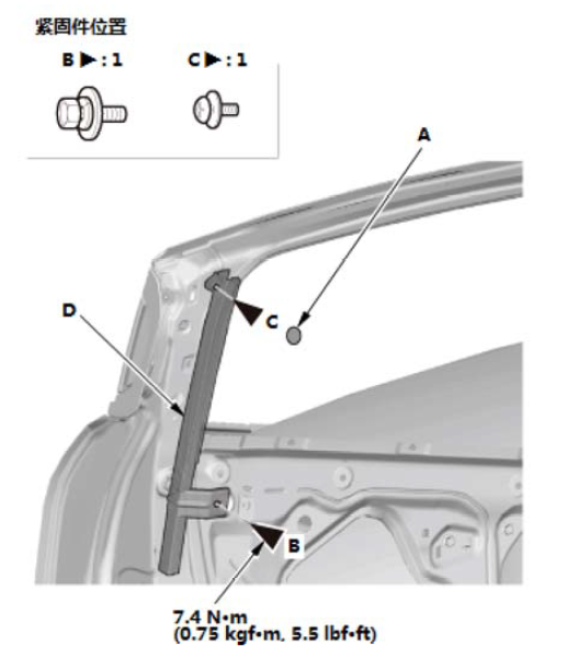 3.拆下后车门三角内装饰件。 4.拆下保养孔密封件(A)。 5.从后车门下槽(D)拆下螺栓(B)和螺钉(C) 。 |
