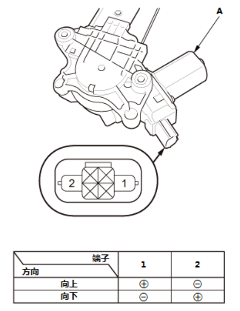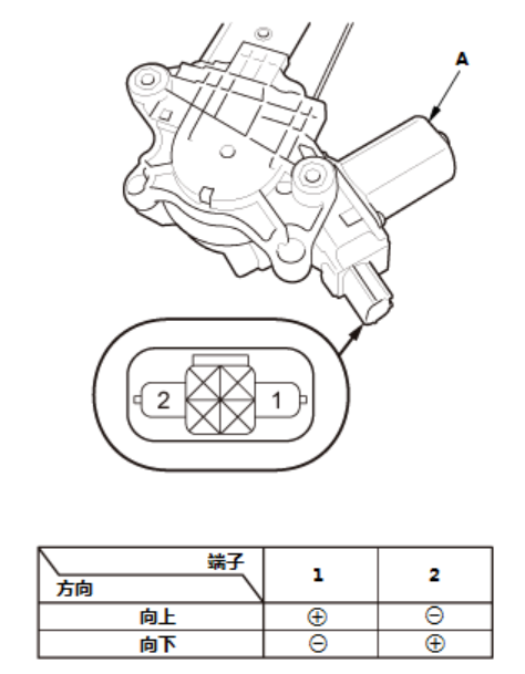 1. 根据下表,通过连接 12 V 蓄电池电源和搭铁至连接器(A) ,在各方向测试前排乘客侧电动车窗电机。当前排乘客侧电动车窗电机停止运转时,立即断开12 V 蓄电池电源。 如果前排乘客侧电动车窗电机不运转或者运转不平稳,拆下前排乘客侧车门升降器,转至步骤2。 |