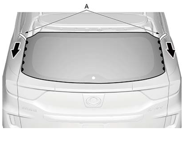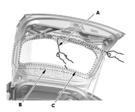 4.如图所示,使用胶带将新的紧固件 (A、B) 固定到尾门的后窗窗洞凸缘的两侧。 |