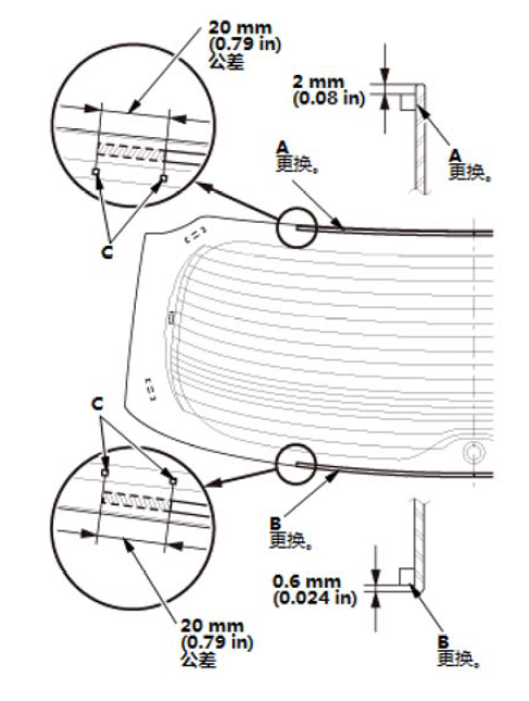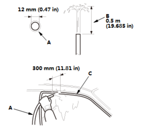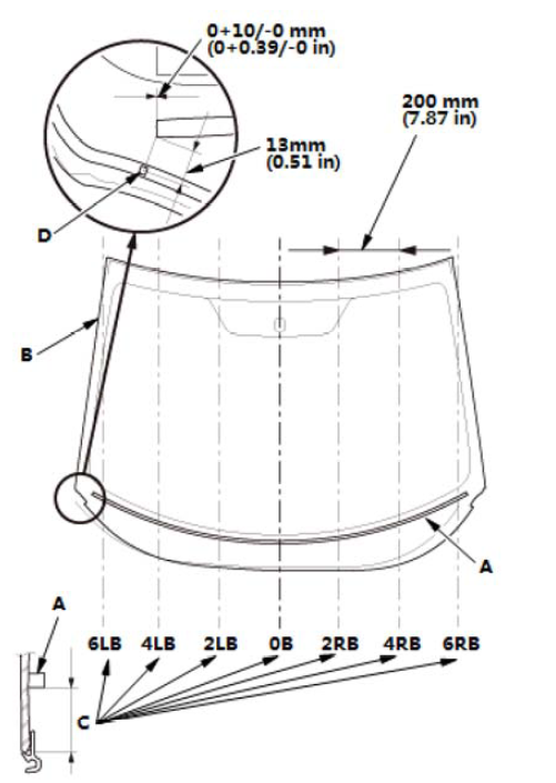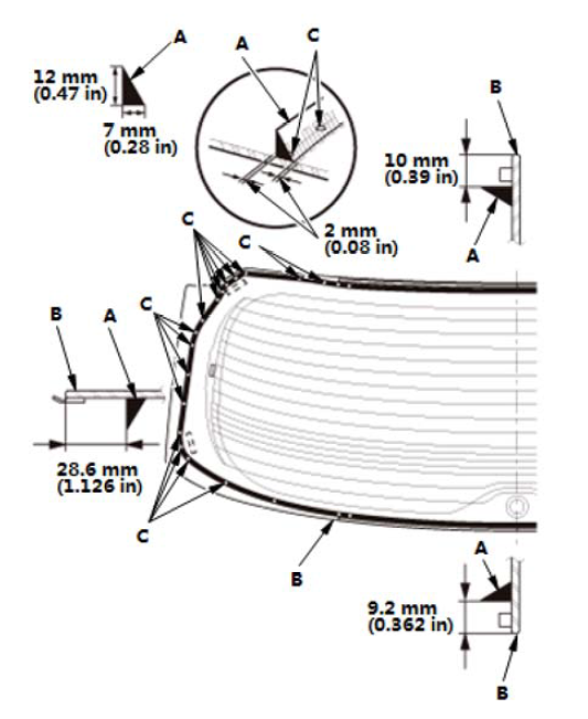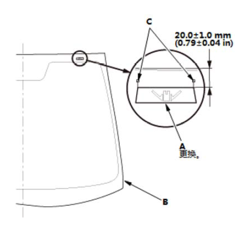 7.如图所示,切割仪表板密封件 (A) 至合适长度,然后用胶带将仪表板密封件安装到挡风玻璃 (B) 的内表面上。 仪表板密封件长度: 仪表板密封件位置: (C): 0B 84 mm (3.31 in) 2LB 89 mm (3.5 in) 2RB 104 mm (4.09 in) 4LB 109 mm (4.29 in) 4RB 129 mm (5.08 in) 6LB 69 mm (2.72 in) 6RB 84 mm (3.31 in)