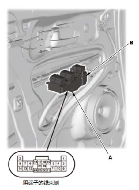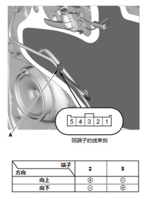 1.拆下驾驶员侧车门扬声器。 2. 断开连接器 (A)。 3. 检查连接器 4 号端子和车身搭铁之间是否导通。应导通。