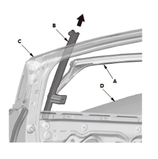 6.如有需要,拉出玻璃升降槽(A)。 7.从后车门(C)和后车门玻璃(D)上拆下后车门下槽 (B)。 8.从后车门拉出后车门下槽。 |