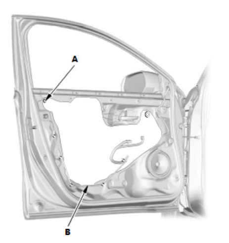 1.断开连接器(A)。 2.通过车门孔拆下螺栓,然后拆下前车门升降器 (B)。 |