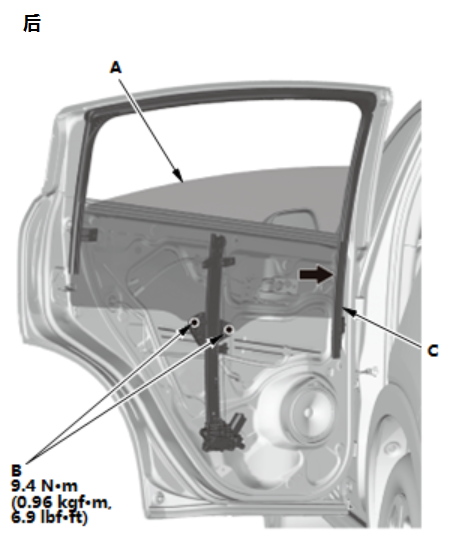 后车门玻璃和调节器拆卸和安装 |