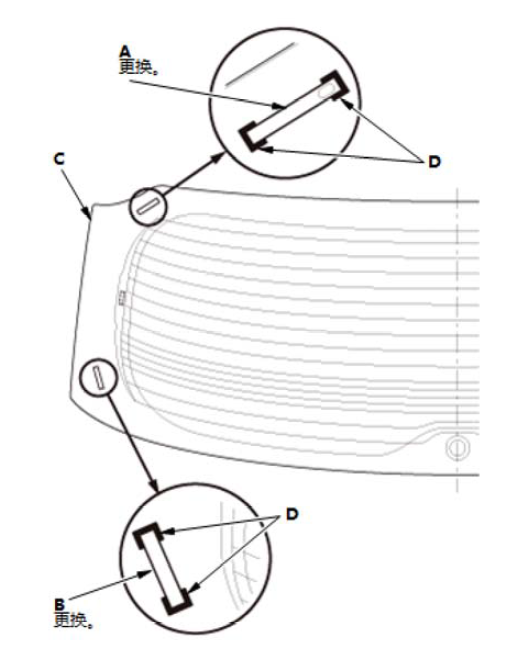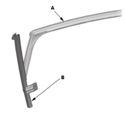 5.如图所示,用胶带将新的挡风玻璃侧装饰条(A) 安装到挡风玻璃 (B) 上。
