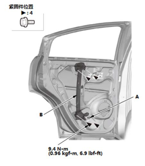 1.降低后车门玻璃 A)直至完全打开,然后拆下玻璃安装螺栓。 2.固定后车门玻璃时,拆下螺栓。 |