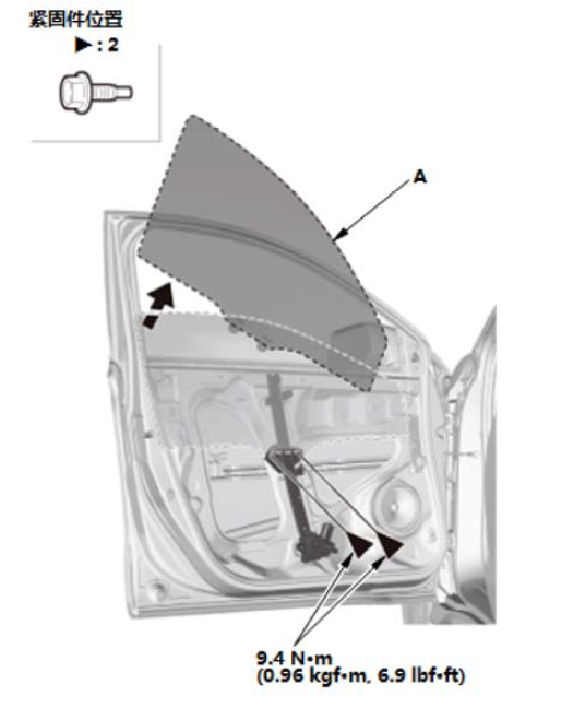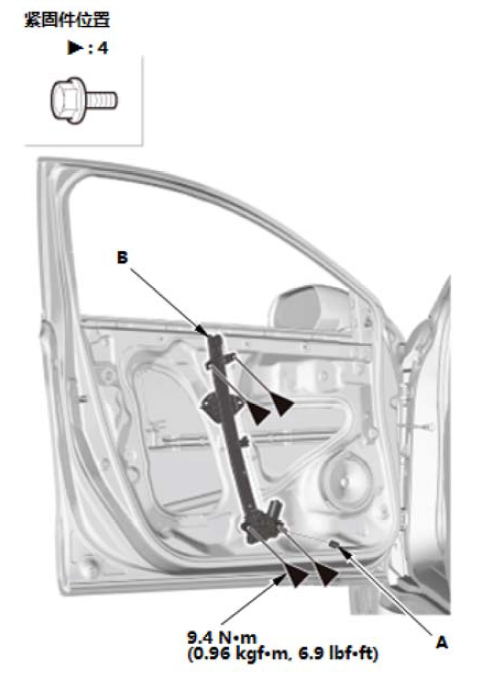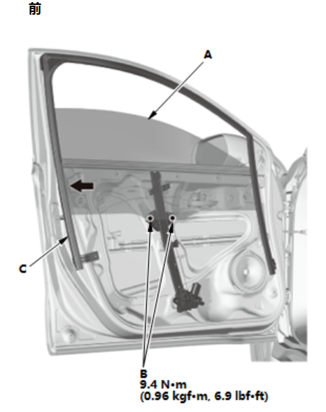 1.降低前车门玻璃(A)直至能看到螺栓,然后拆下螺栓。 2.小心地从前车门窗槽里拉出玻璃。