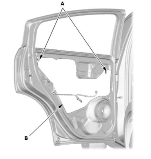 1.断开连接器(A)。 2.通过后车门孔拆下螺栓,然后拆下后车门升降器 (B)。 |