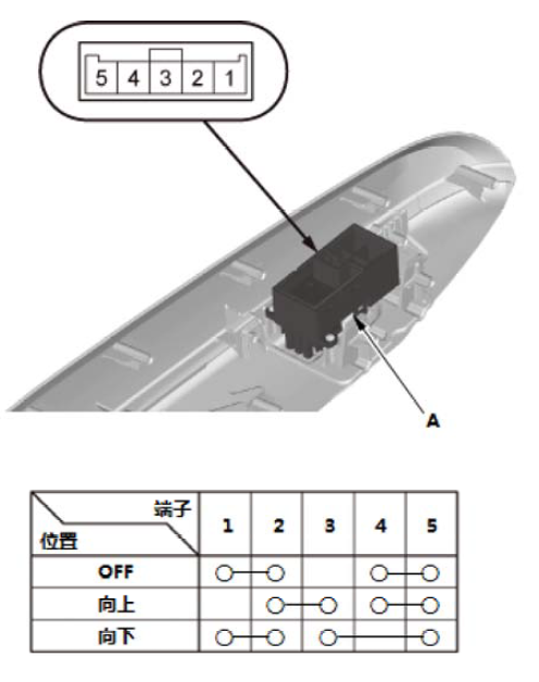 1.根据下表检查端子之间是否导通。 2.如果导通性与规定不符,则更换后电动车窗开关(A)。 |