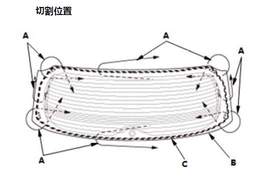 1.使用经异丙基酒精浸湿的抹布清洗车身粘合表面。清洗后,不要让机油、润滑脂和水溅到清洗表面。 2.如果重新安装原来的后车窗,使用油灰刀刮除后车窗上旧的粘合剂、紧固件、密封件和橡胶密封条。使用异丙基酒精清洗后窗内表面和边缘的粘合表面。确保粘合表面没有水、机油和润滑脂。 3.如图所示,用胶带将紧固件 (A、B) 安装至后窗 (C) 的内表面。