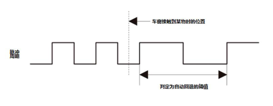 自动上升操作期间检测到有些物体时,车窗会停止关闭并下降约70 mm (2.75 in)。如果车窗开启不足一半(约220 mm (8.66 in)),它将下降至开启一半的位置(约220 mm (8.66 in))。此功能的激活基于电机脉冲A 转速和负载变化的计算结果。